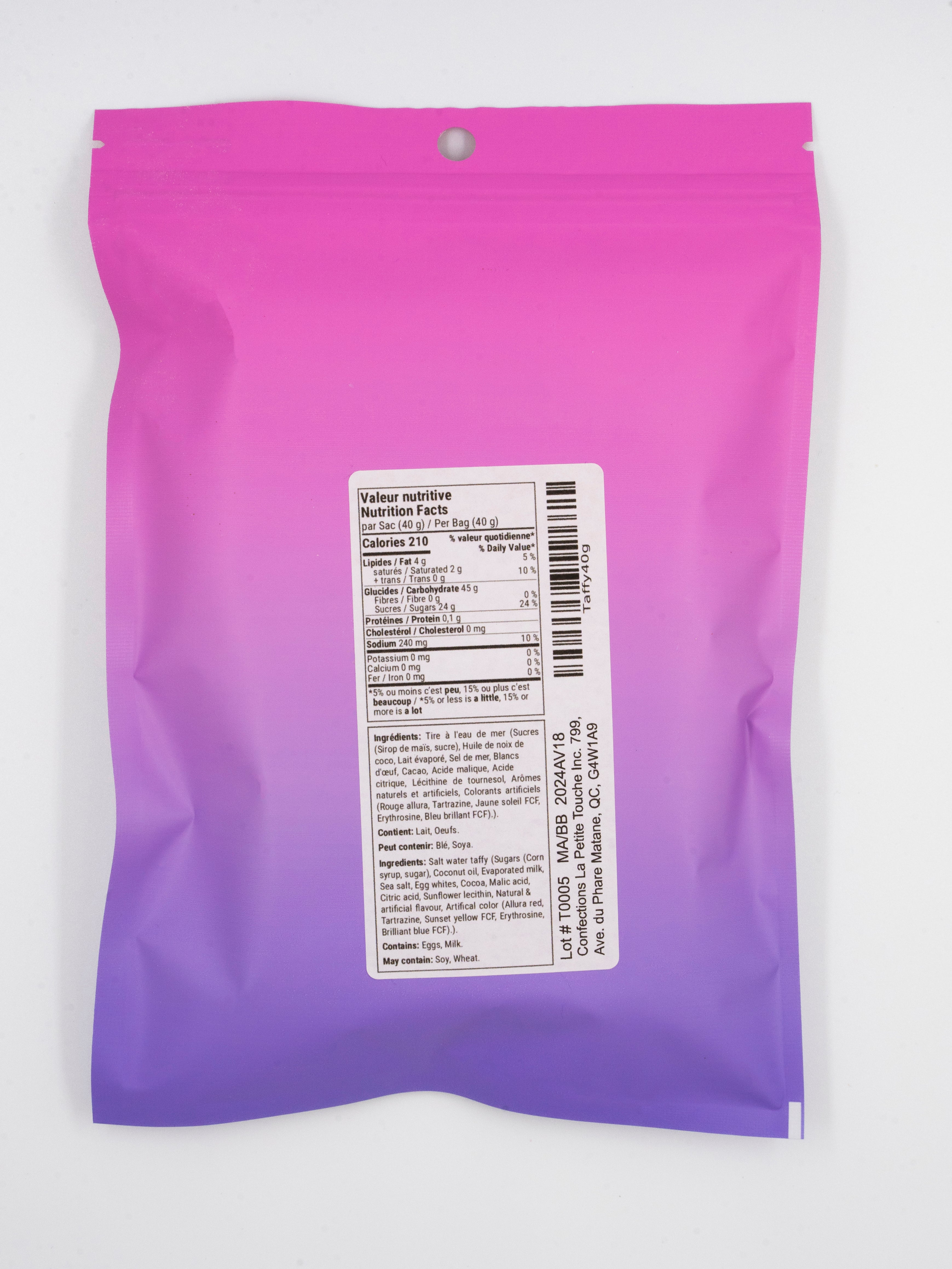 Nos friandises sont manipulées et transformées dans des conditions contrôlées par du personnel qualifié dans notre atelier de confection spécialement aménagé pour répondre aux exigences en matière de sécurité alimentaire. Chaque sac est méticuleusement emballé à la main et est toujours inspecté avant d’être expédié.