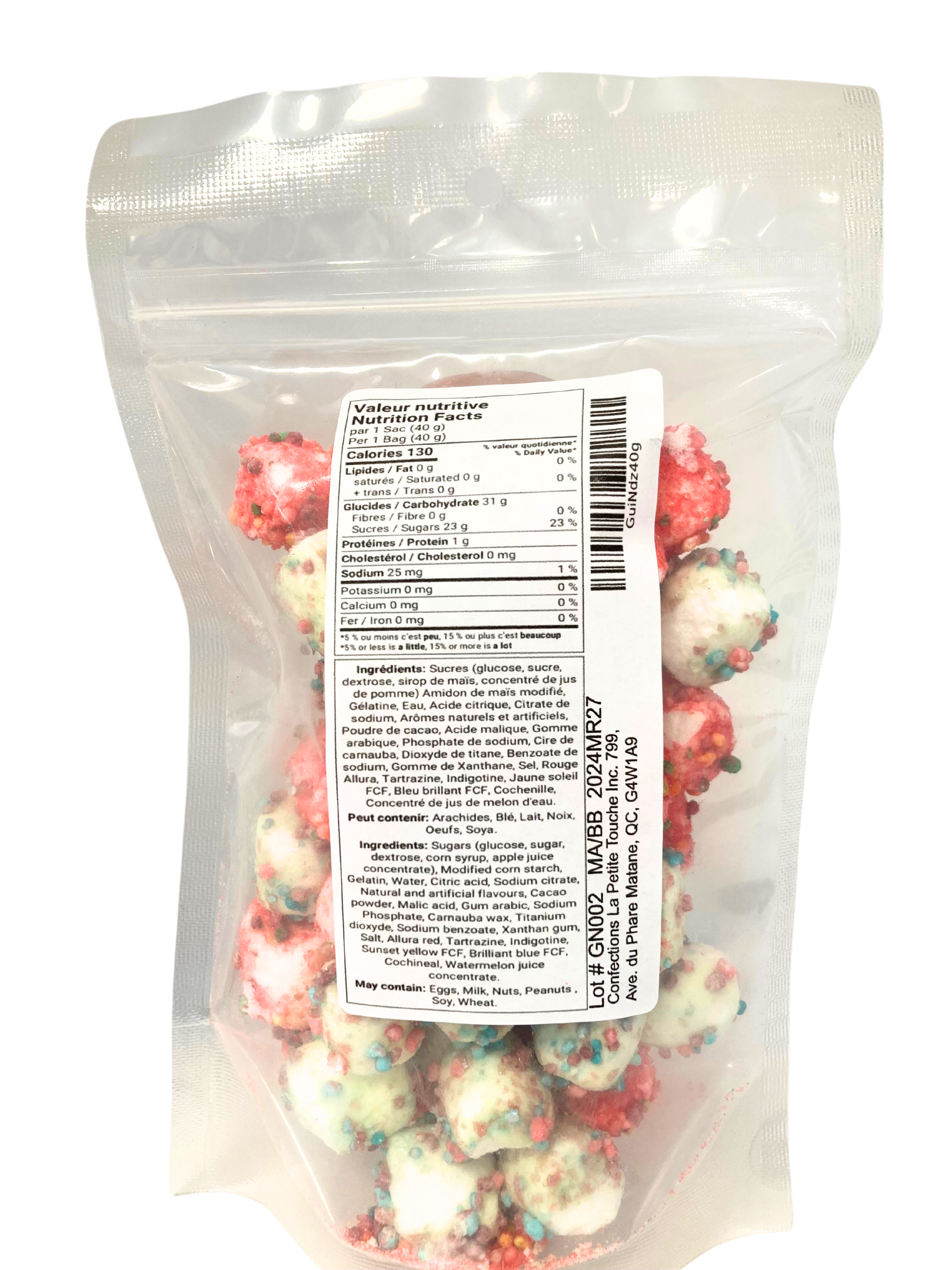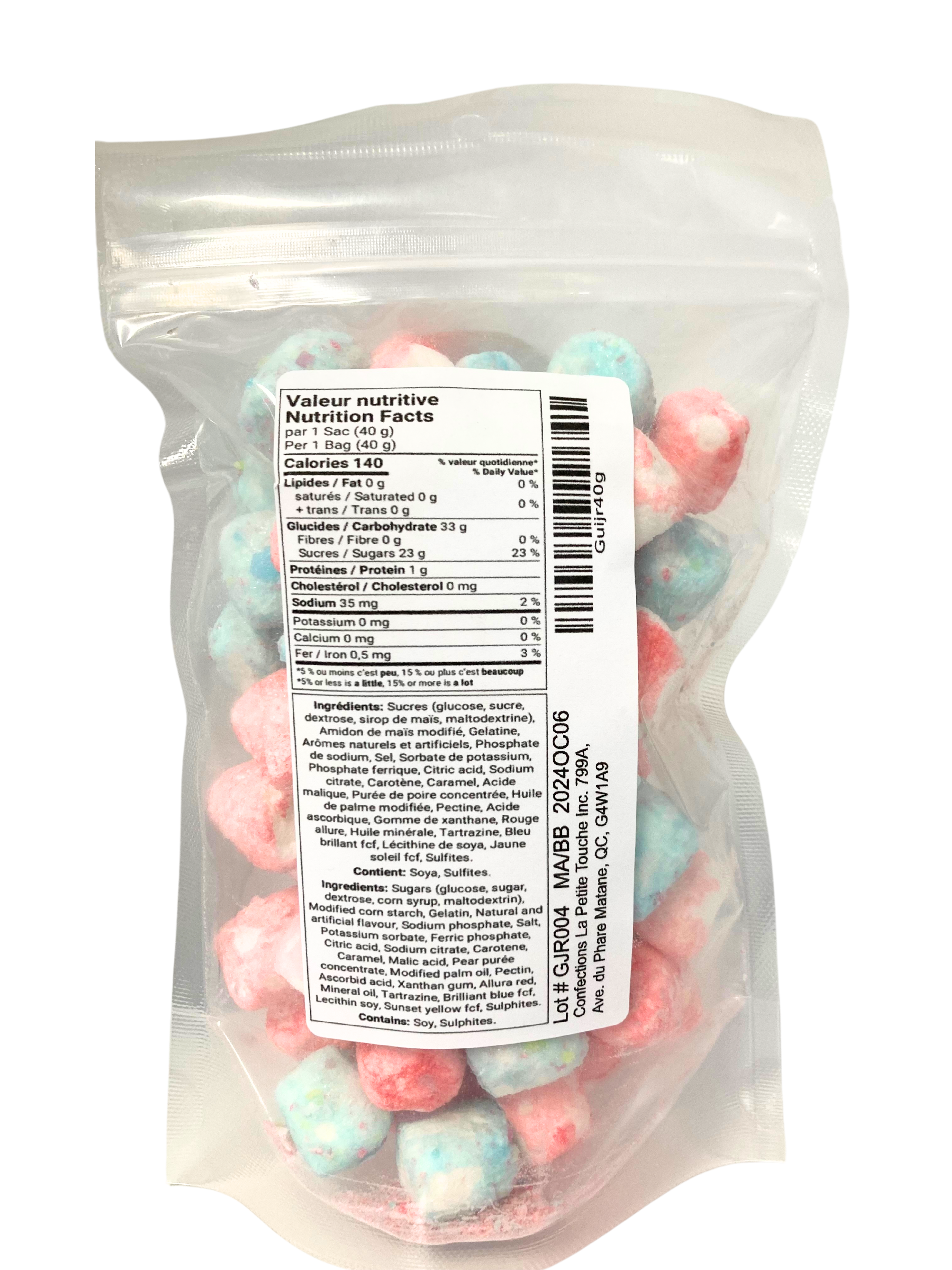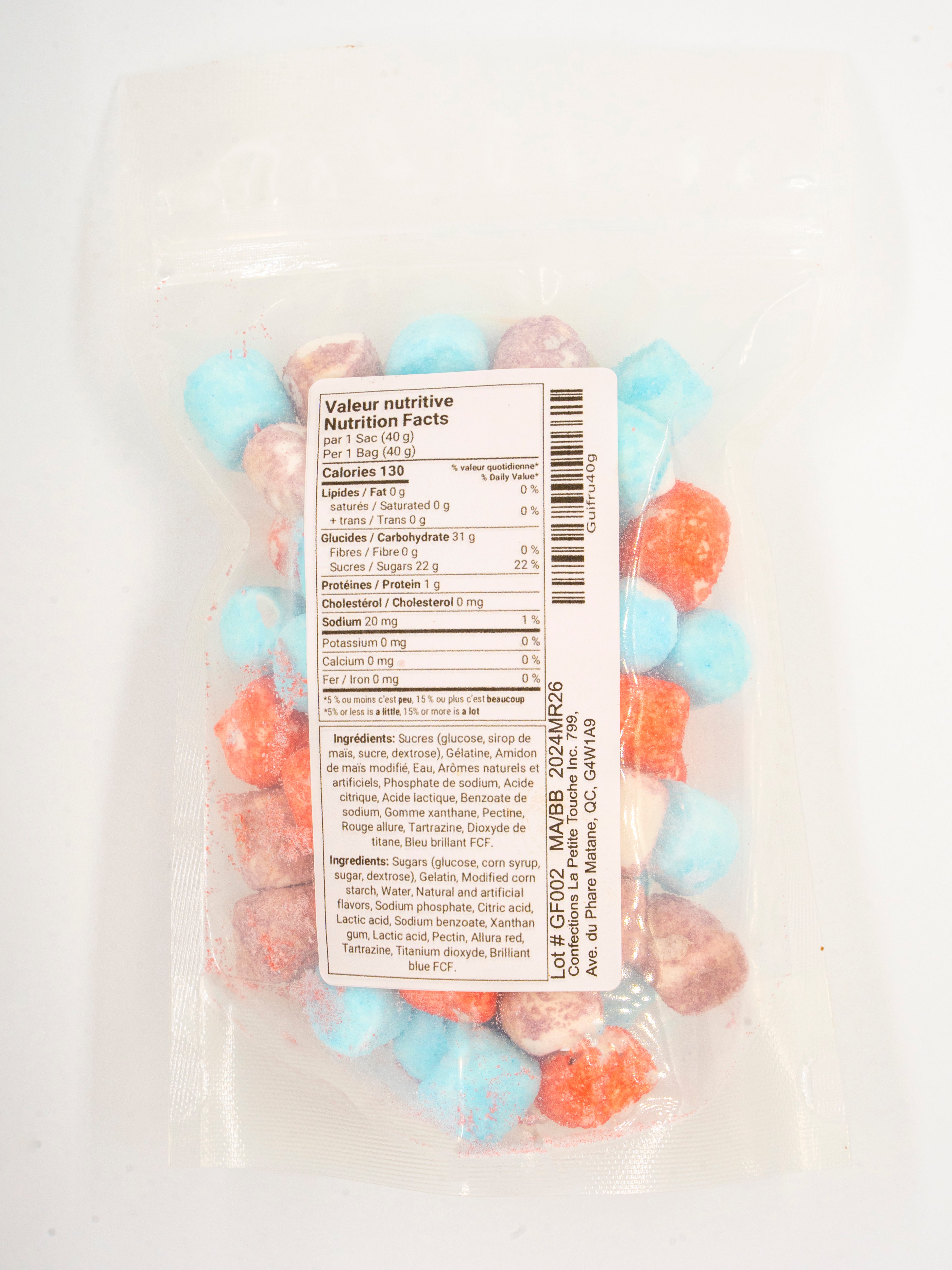 Nos friandises sont manipulées et transformées dans des conditions contrôlées par du personnel qualifié dans notre atelier de confection spécialement aménagé pour répondre aux exigences en matière de sécurité alimentaire. Chaque sac est méticuleusement emballé à la main et est toujours inspecté avant d’être expédié.