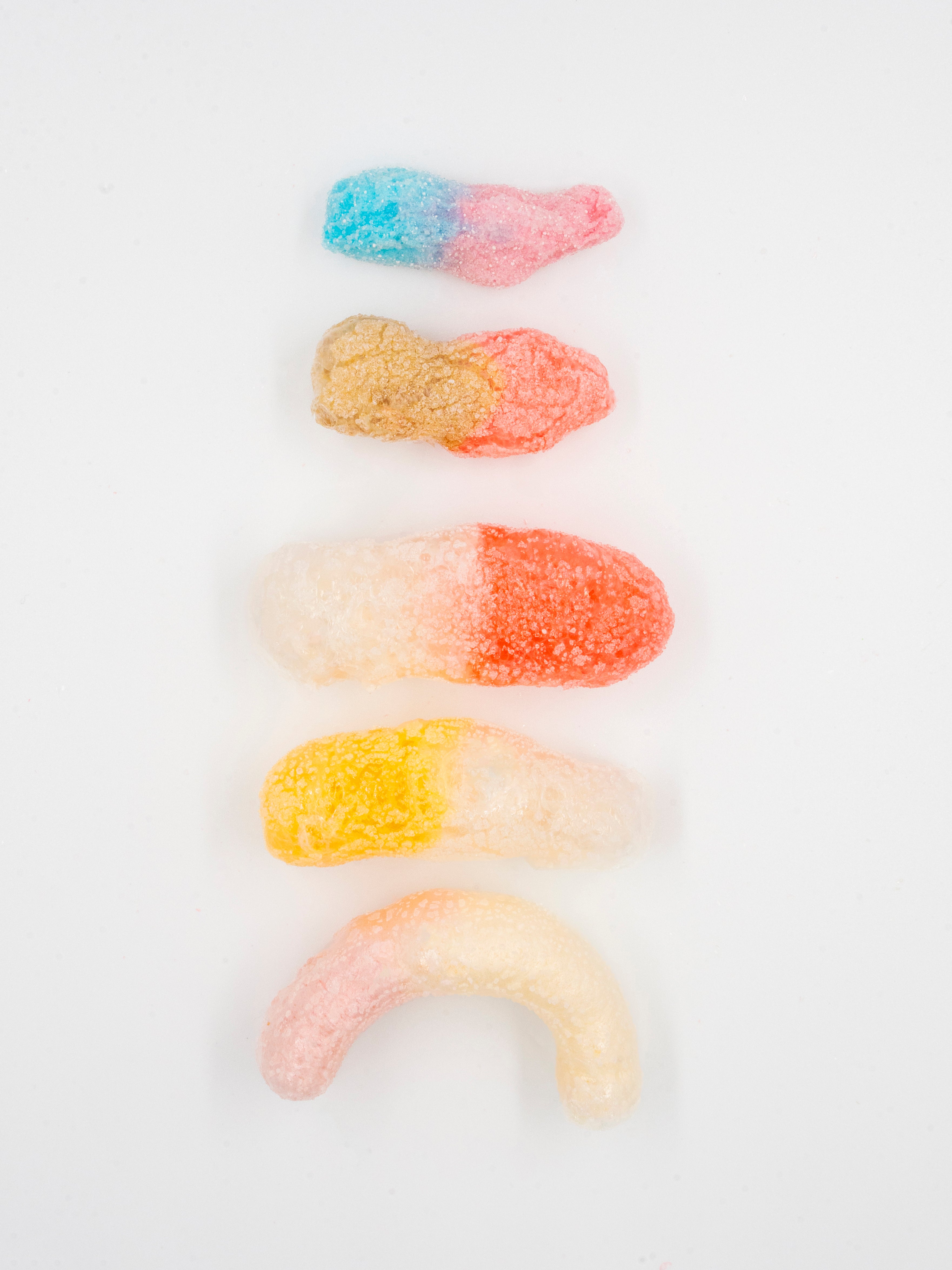 D’abord, chaque bonbon lyophilisé gonfle et devient disproportionné ce qui modifie drastiquement leur structure interne. Chaque friandise révèle ainsi une drôle de forme et une texture totalement différente qui va du craquant, du croustillant, du spongieux puis au fondant.