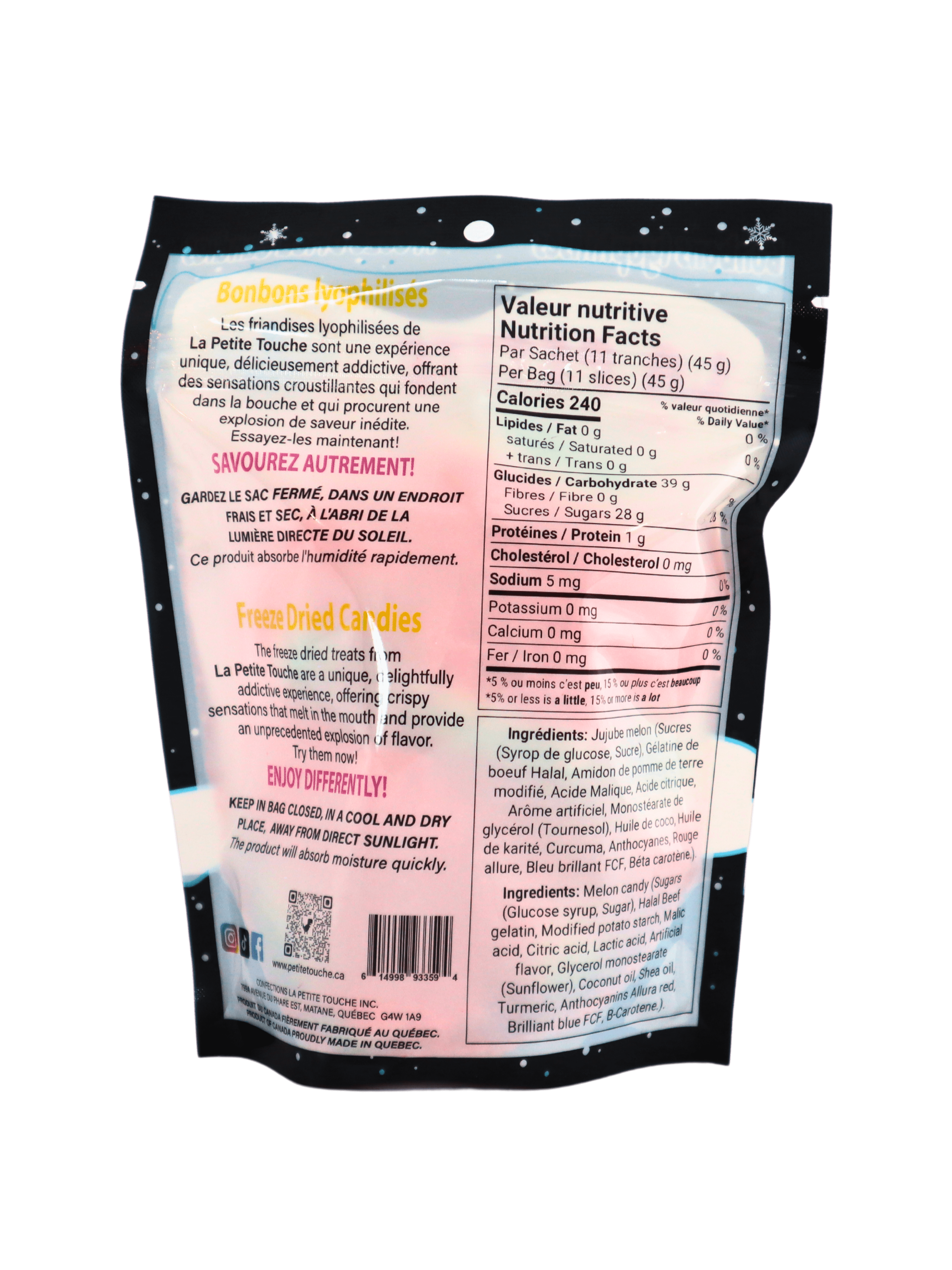 Il y a deux textures bien distinctes sur un même bonbon soit le croquant et le fondant ce qui rend l’expérience vraiment unique et agréable. De plus, comme avec toutes les friandises de La Petite Touche, il y a une véritable explosion de saveur mais cette fois aux goûts de melons ultra savoureux. Un choc pour vos papilles!