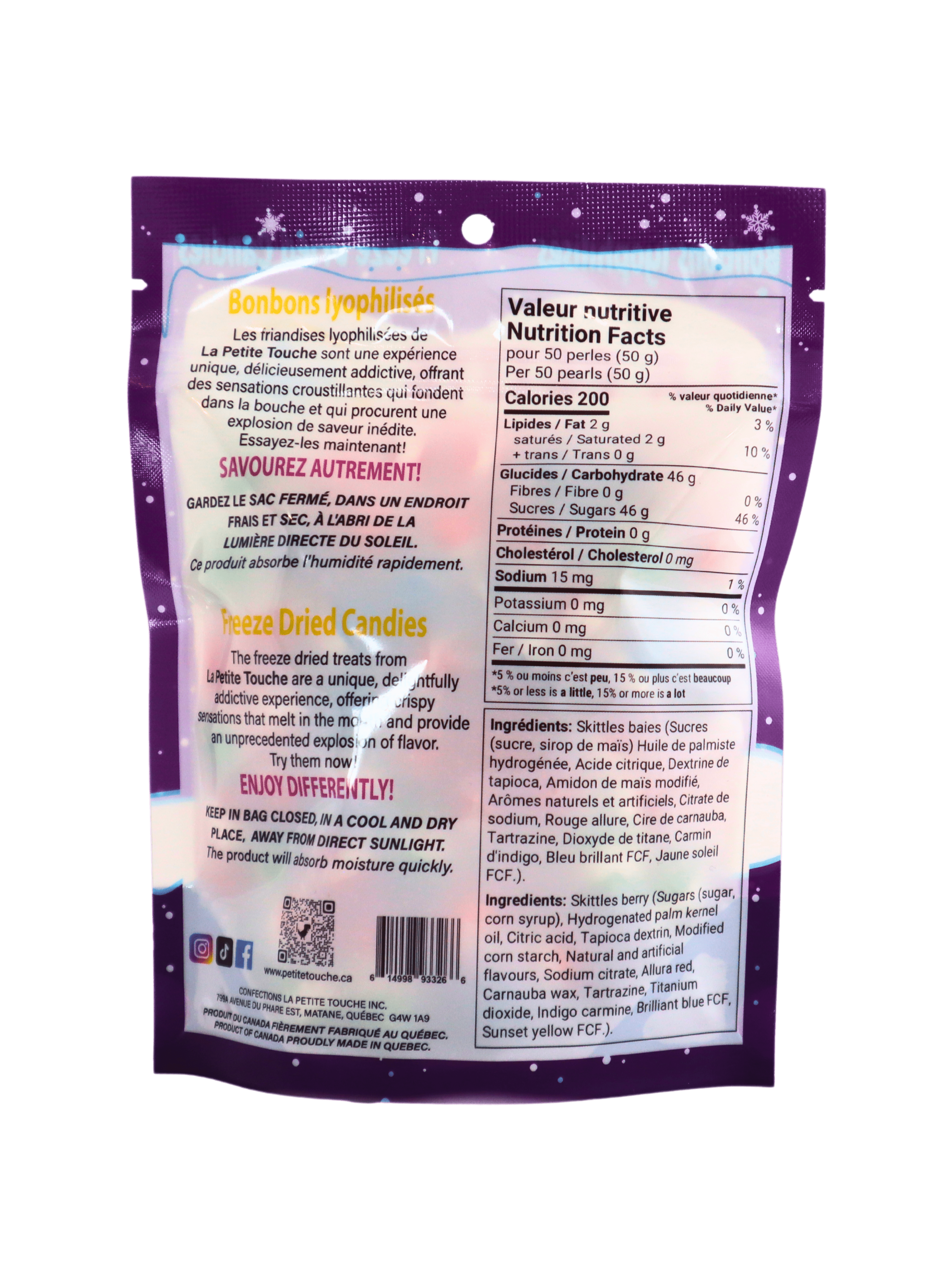 Découvrez le summum de la gourmandise avec nos Perles aux Baies, une célébration de saveurs fruitées intensément riches et délicieuses. Ces petites merveilles, nées de la transformation lyophilisée des célèbres Skittles Very Berry, sont une ode à la splendeur des fruits des bois.