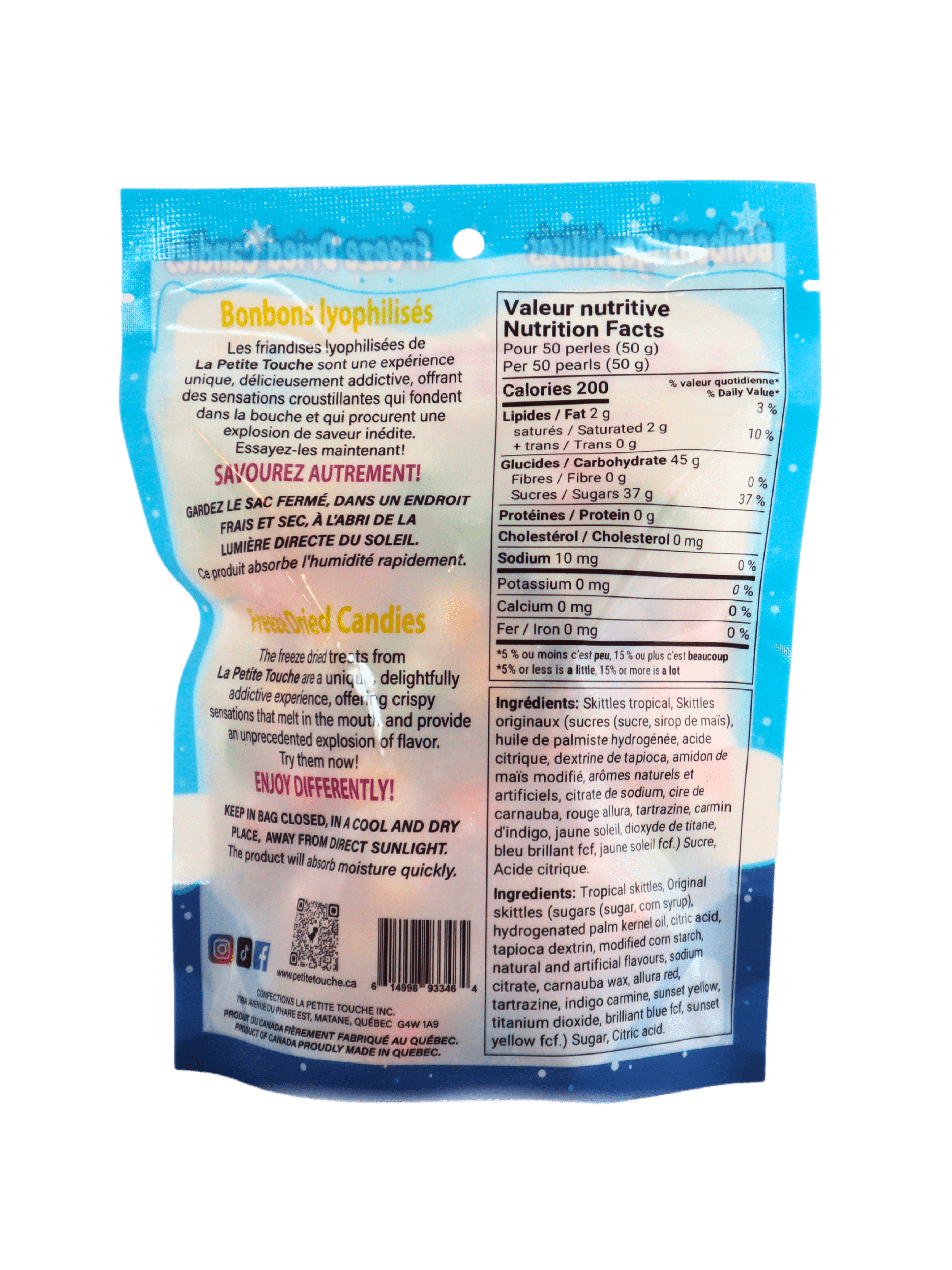 Chaque bonbon lyophilisé de notre mélange surette maison est un petit bijou de goût, mêlant des notes audacieusement aigres-douces qui réveillent les sens. Ces Skittles transformés vous offrent un voyage gustatif inédit, un mélange parfait entre l’acidité stimulante et la douceur des saveurs originales et tropicales.