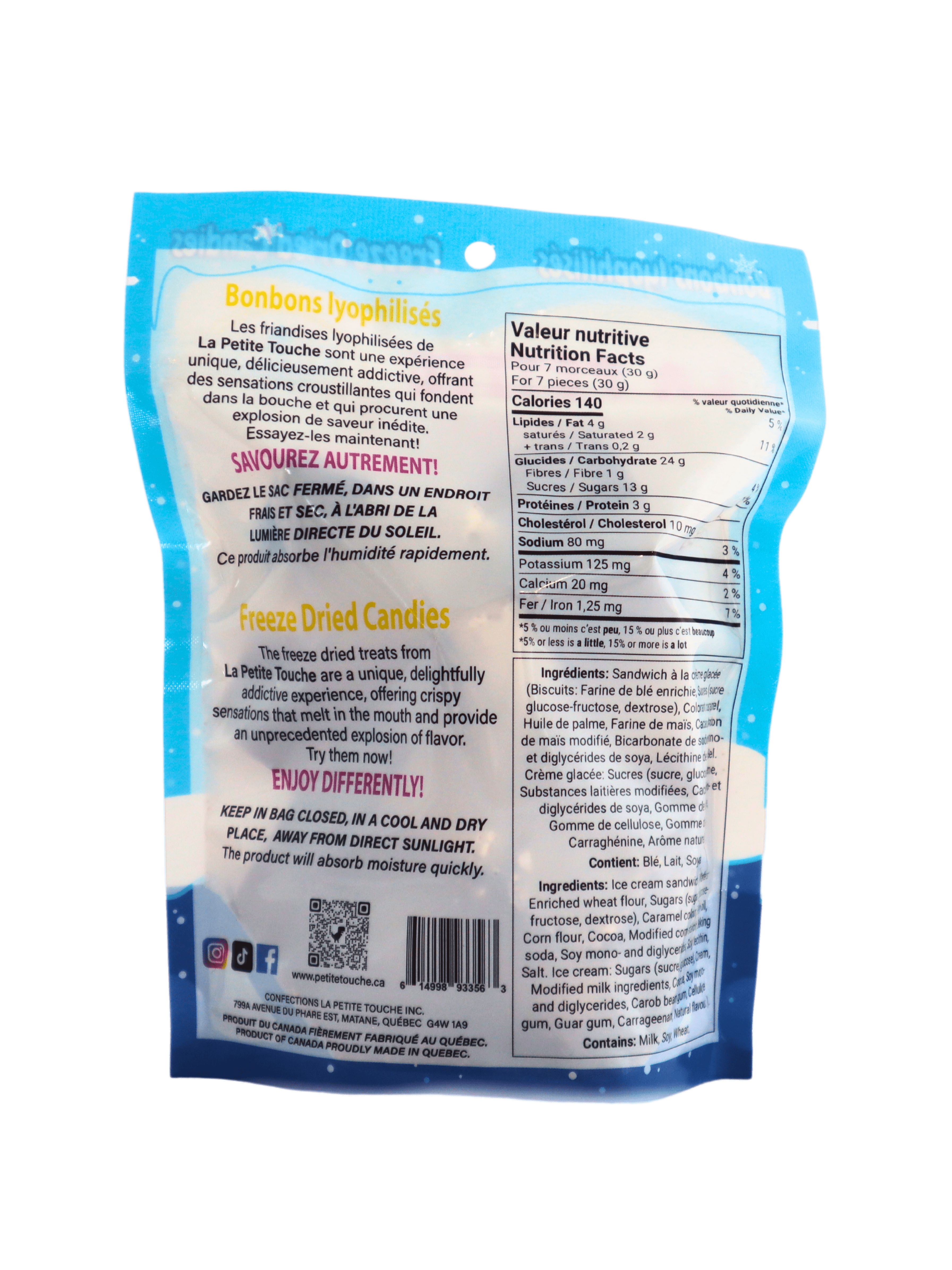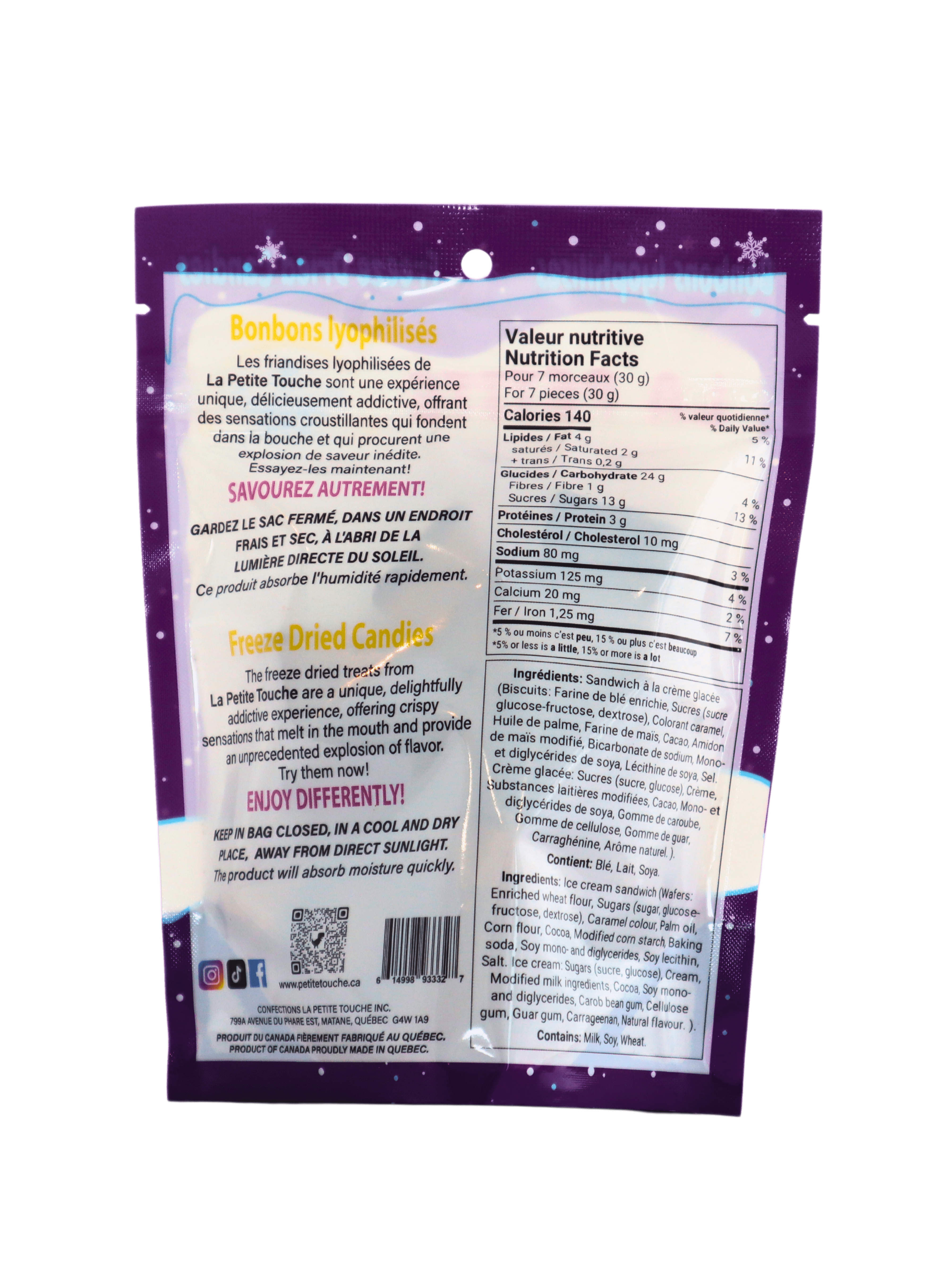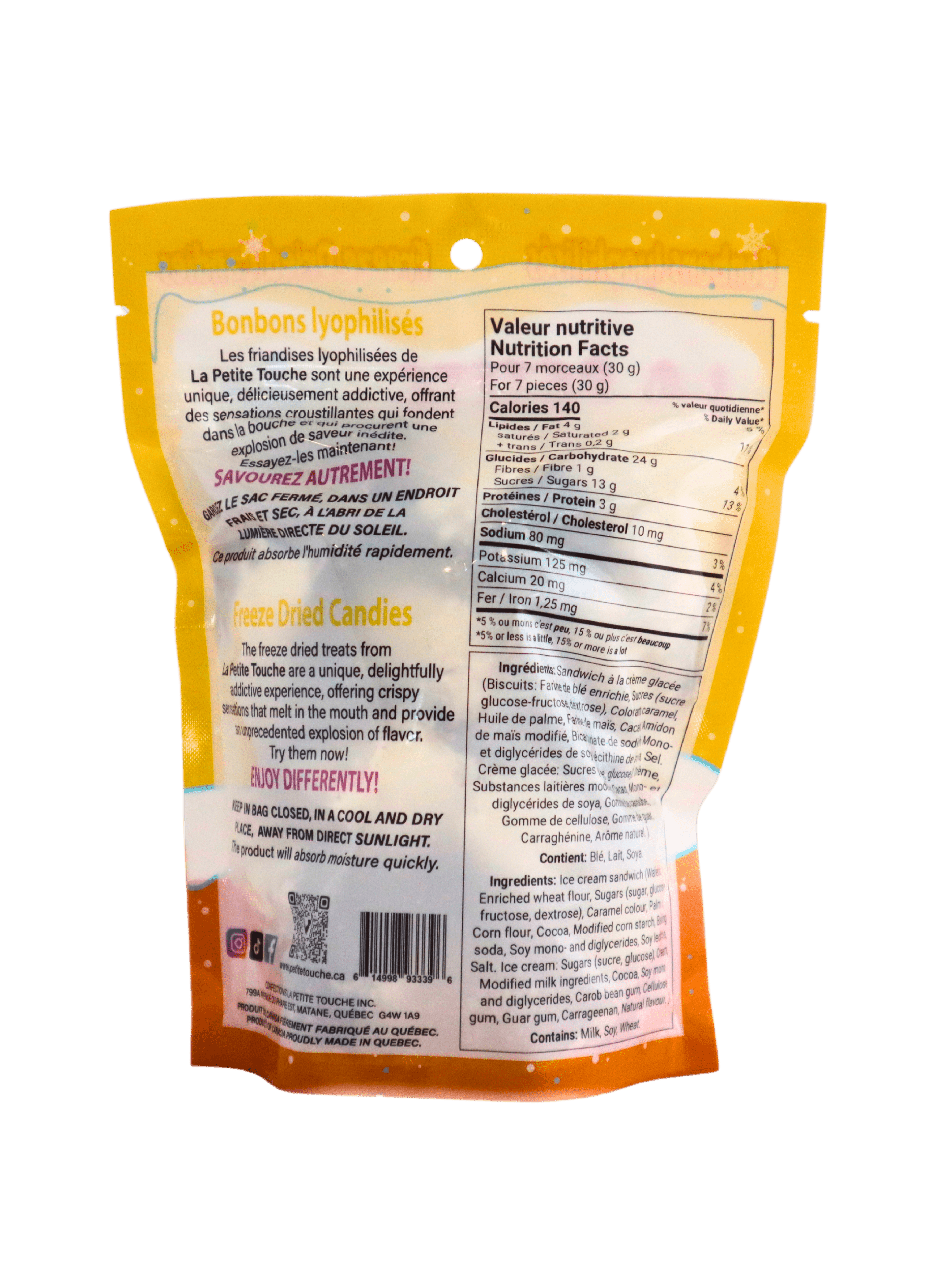 Embarquez pour une aventure culinaire avec nos sandwichs craquantes à la crème glacée lyophilisés, une gourmandise révolutionnaire qui vous transporte directement dans l’irréel avec des saveurs et des textures illogiques! C’est tellement spécial que la première fois qu’on y goûte, notre cerveau ne comprend même pas ce qui arrive.