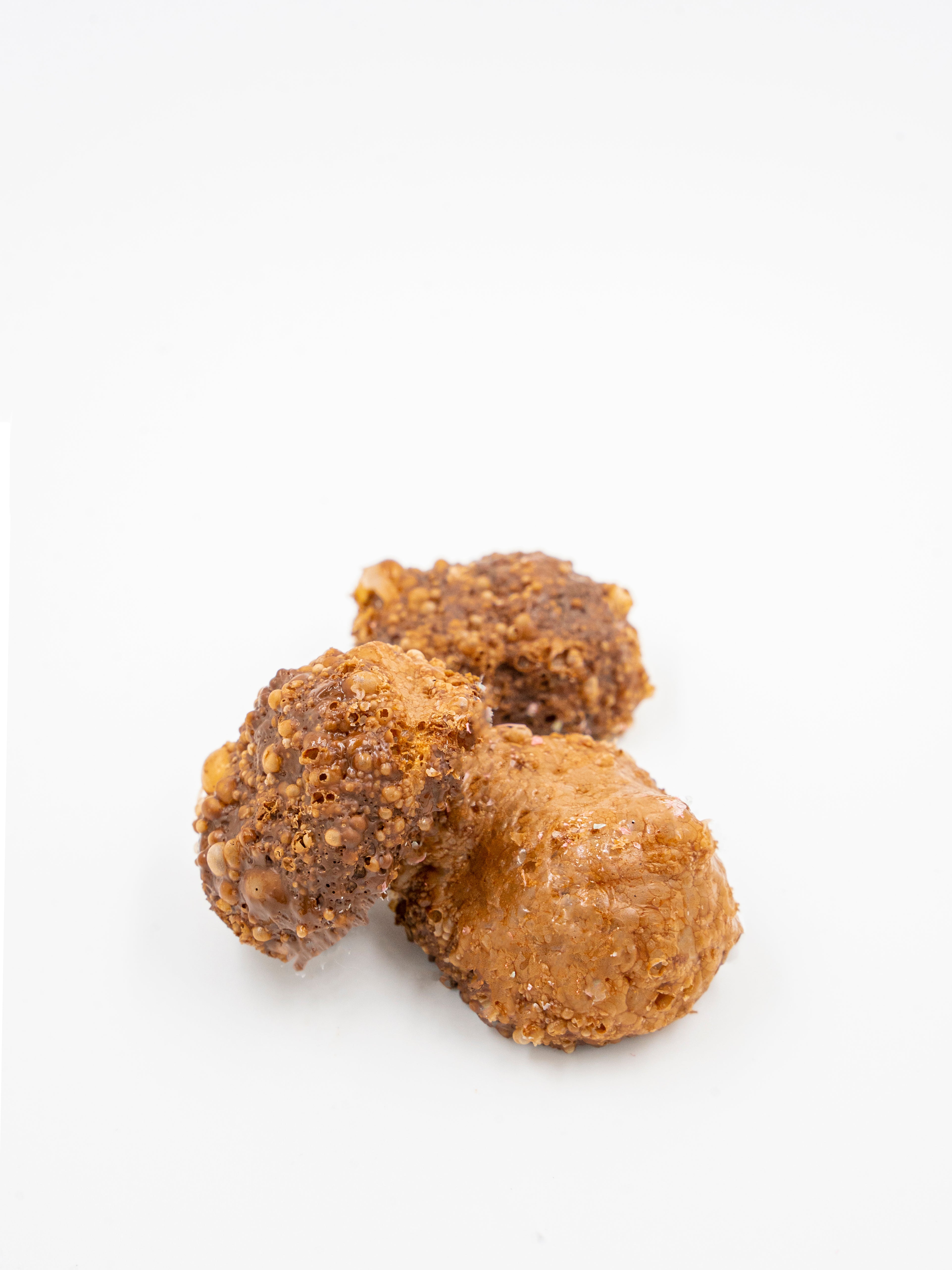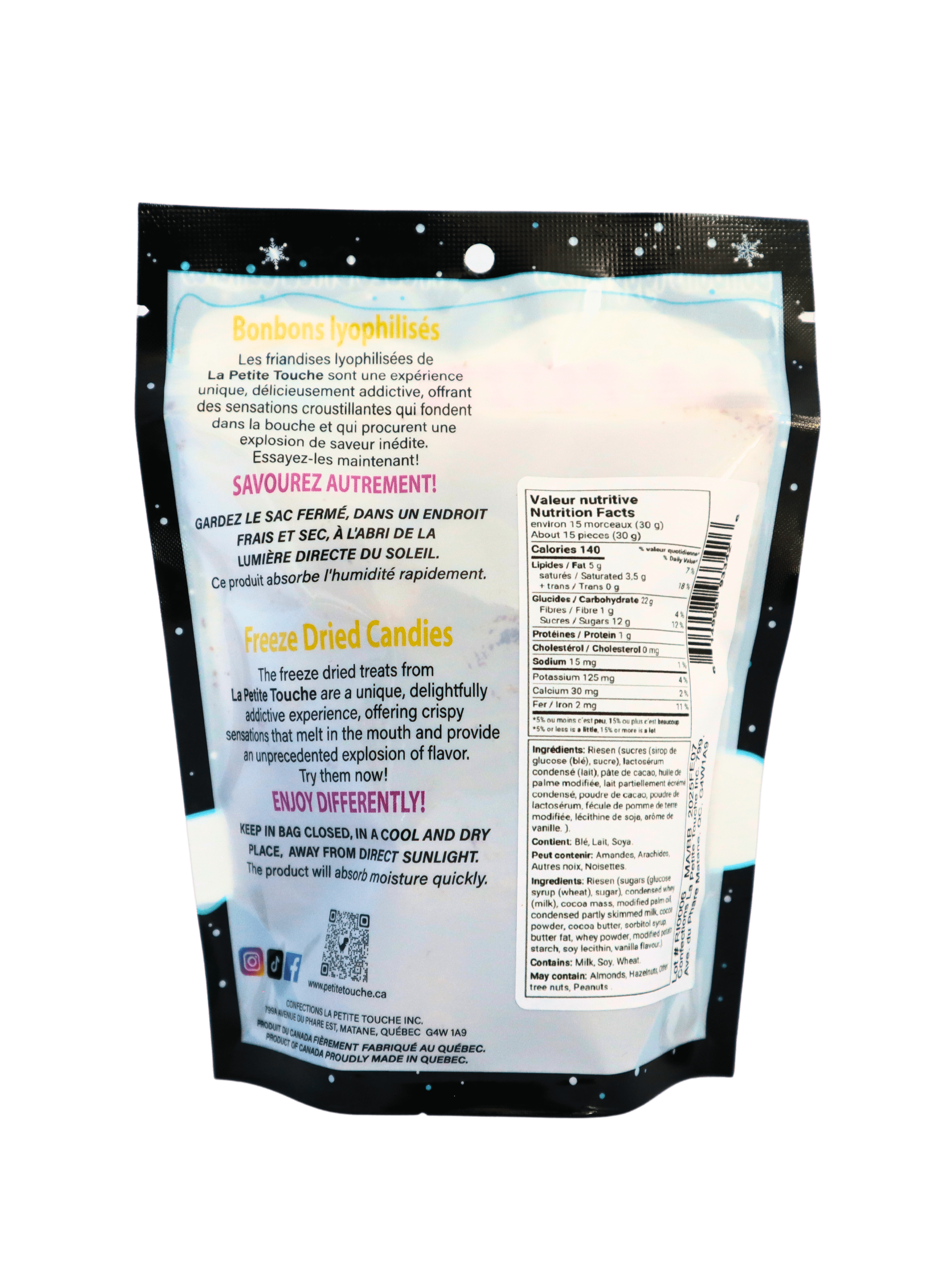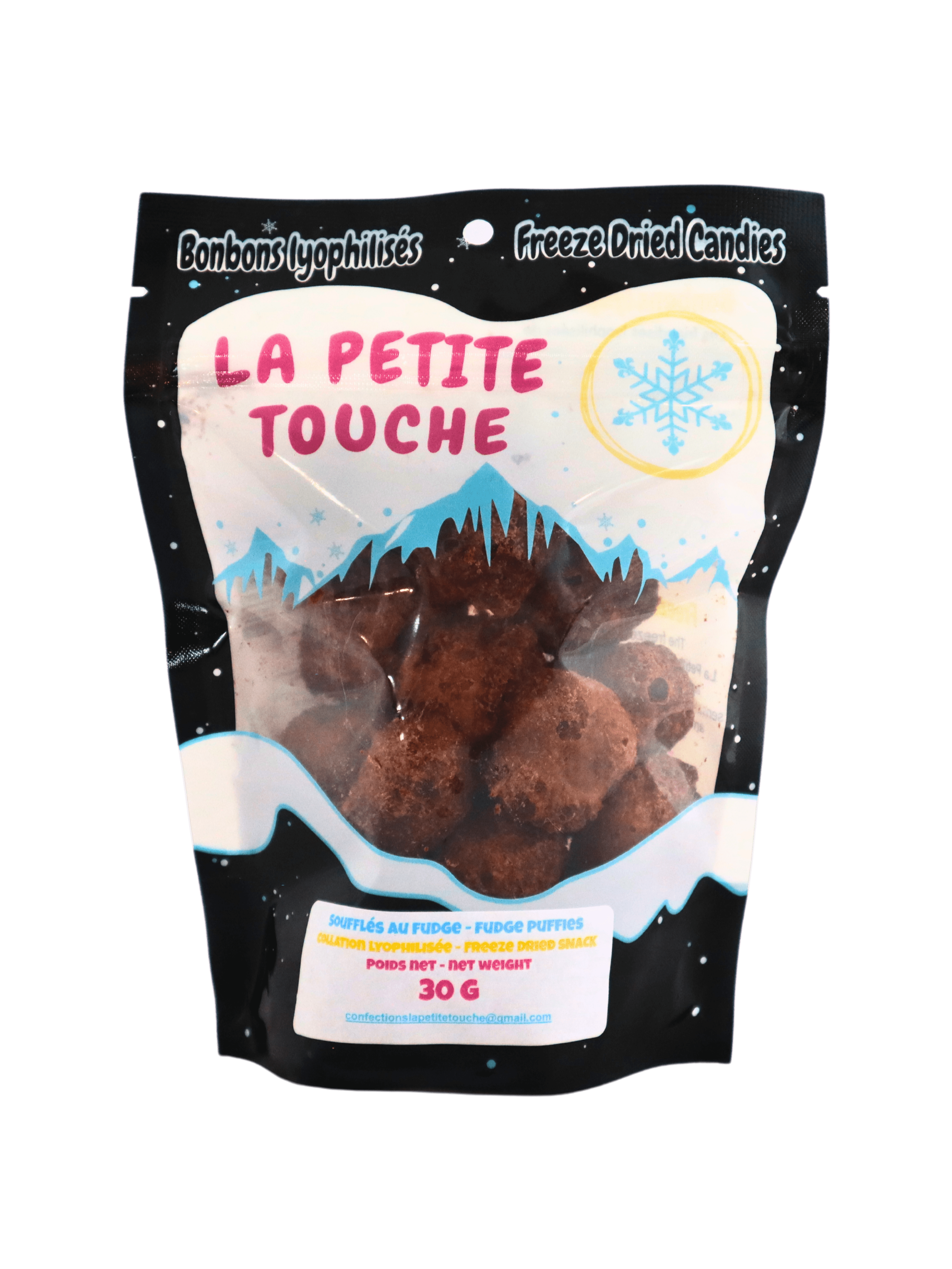 Saviez-vous que le bonheur en sac existe? Il a un goût velouté de fudge et de chocolat. Nos soufflés au fudge lyophilisés permettent aux amateurs de cacao de profiter de leur saveur chouchou de façon unique. La lyophilisation apporte une touche d’originalité, de croustillant et de fondant à cette bouchée.